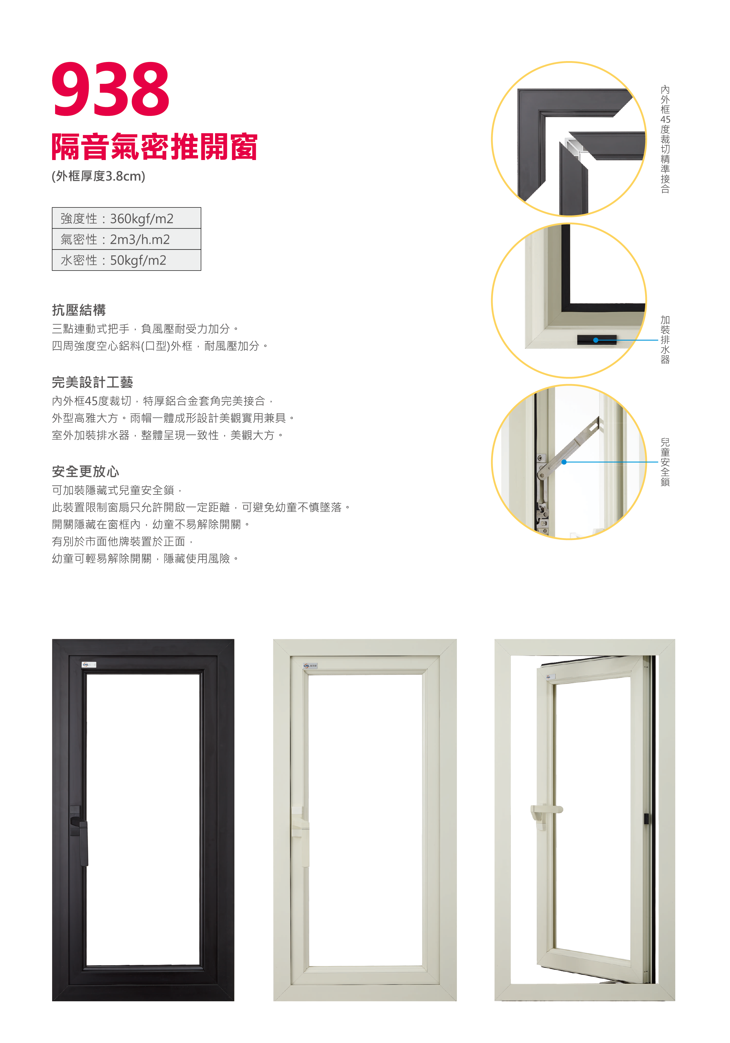 推窗開啟時不易下墜,開啟平順。三點式加壓氣密把手,