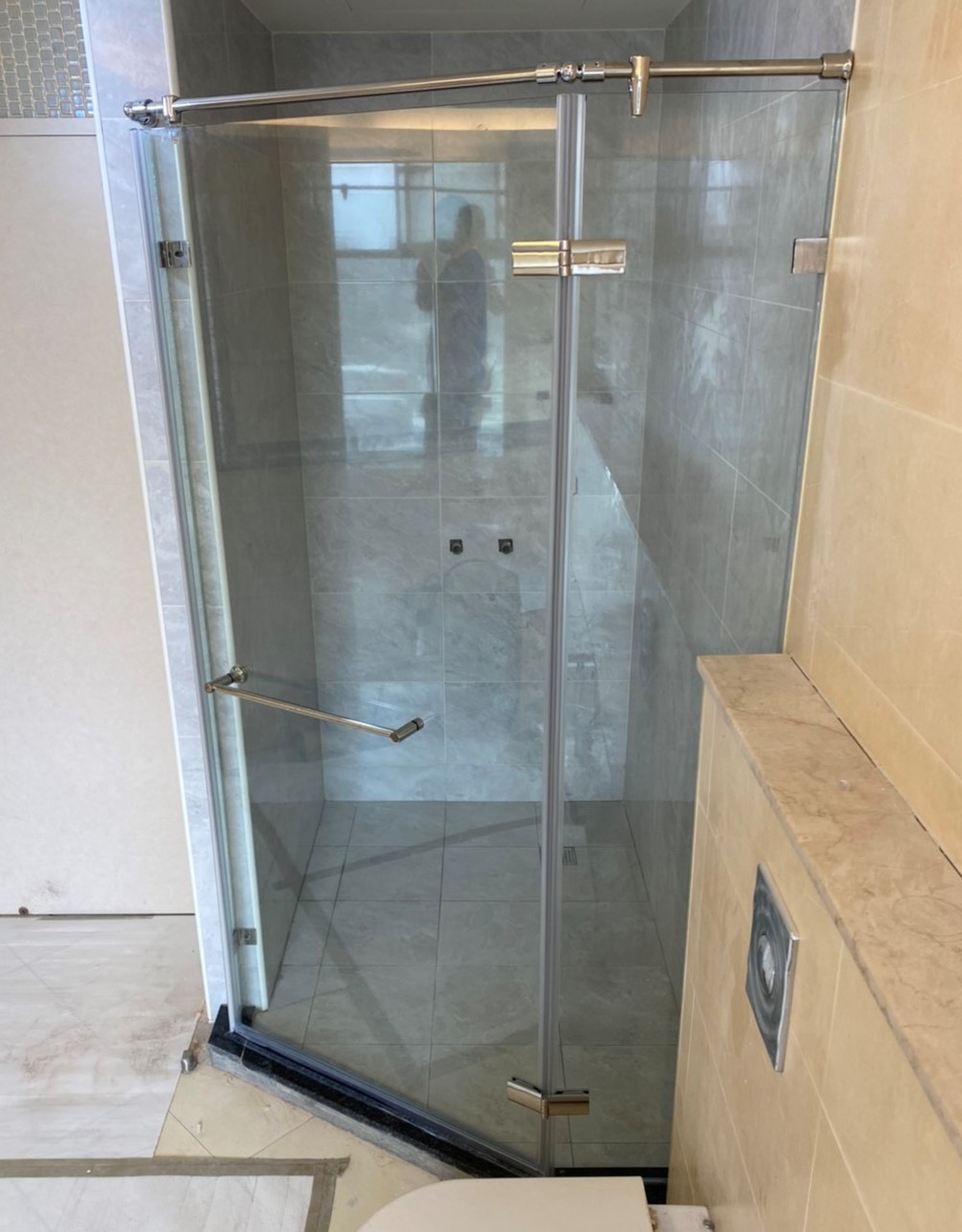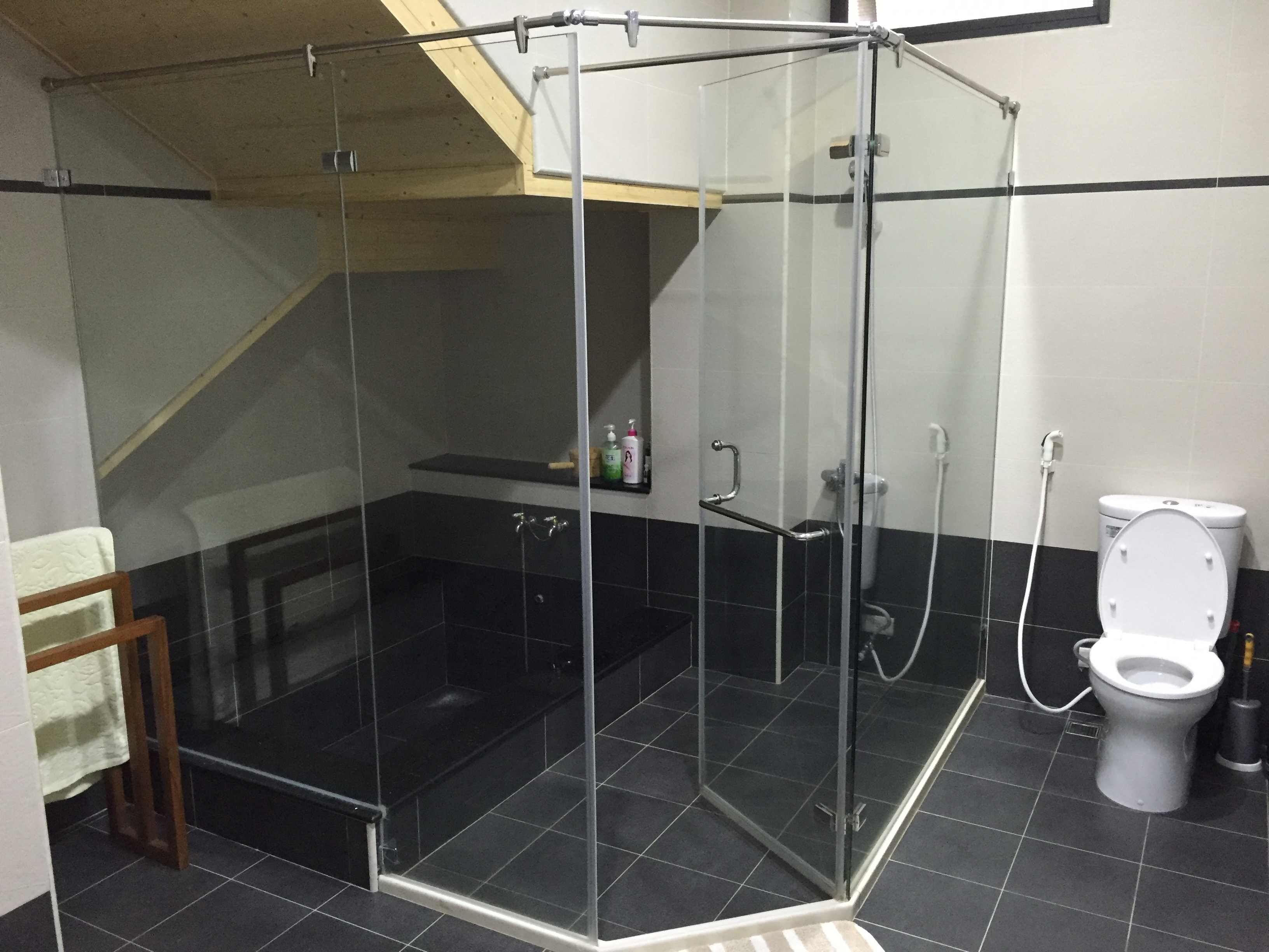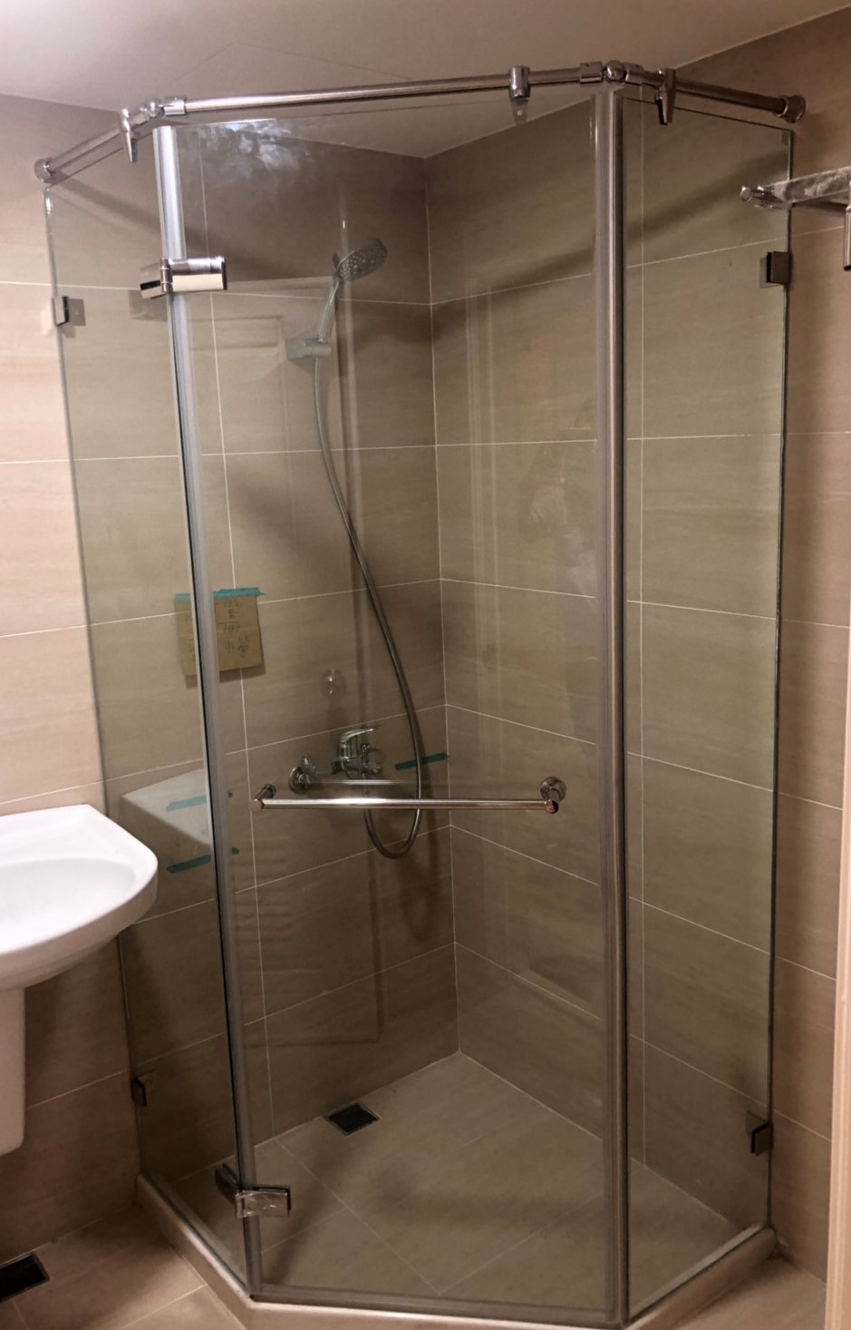 ✽配合一體成型人造大理石門檻、毛巾架把手、門片上方使用不鏽鋼拉桿固定,及開門位置皆有膠條封邊,更能確保防水花濺出,達到乾濕分離的效果。